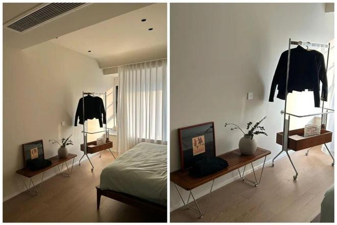 网友@鱼子酱:我就入了床尾凳的坑,为了避免我忍不住再堆衣服,就把它靠墙摆放了,并买了一个落地衣架,强迫自己把衣服挂起来。